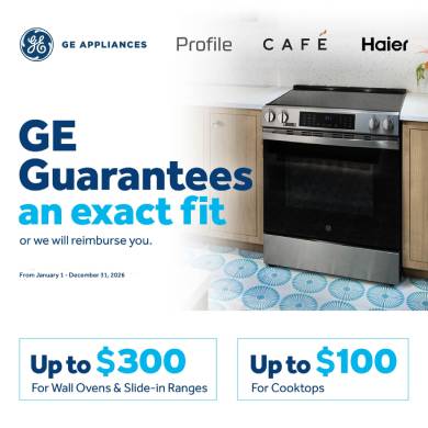GE Guarantees an exact fit or we will reimburse you. Up to $300 For Wall Ovens & Slide-in Ranges Up to $100 For Cooktops Offer Valid From January 1 – December 31, 2026