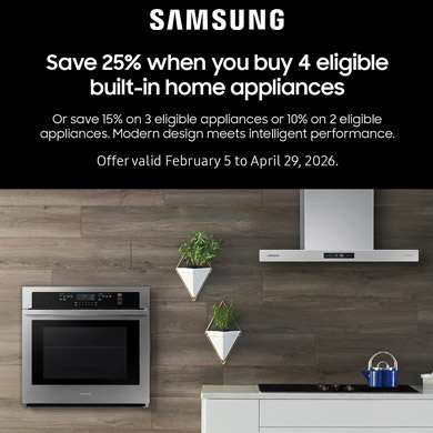 Save 25% when you buy 4 eligible built-in home appliances. Or save 15% on 3 eligible appliances or 10% on 2 eligible appliances. Modern design meets intelligent performance. Offer valid February 5 to April 29, 2026.
