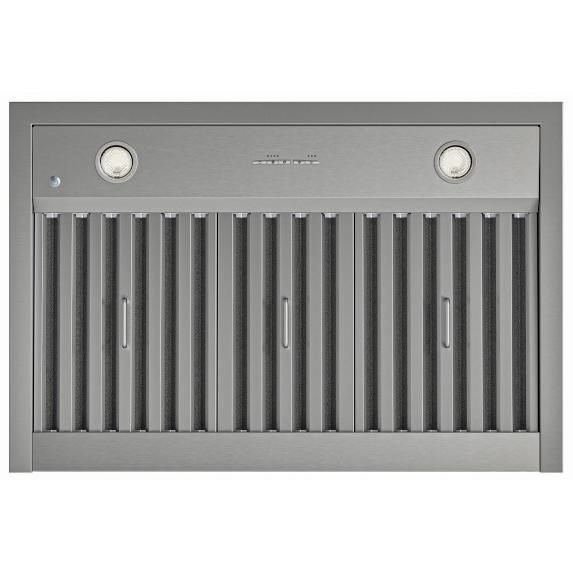 • Distinctive, dishwasher-safe hybrid baffle filters combine aluminum mesh and stainless steel to effectively capture grease for a cleaner, odor-free kitchen