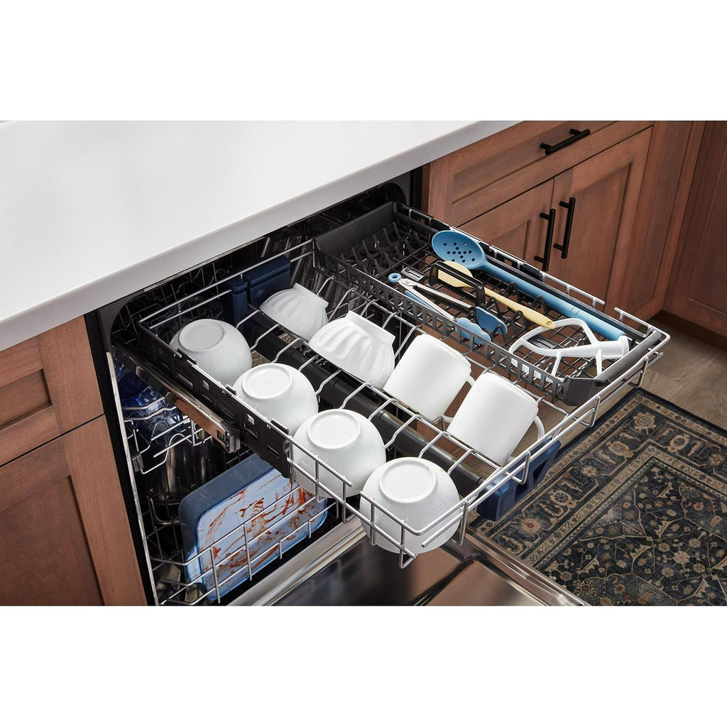 The largest capacity in the market can tackle loads of dishes, including bulky pots and pans usually left for the bottom rack, so there's no need for a second load; third level rack with wash zone.