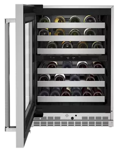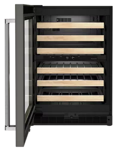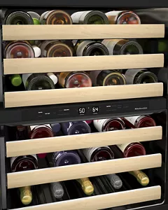 This Undercounter Wine Cellar with Full-Extension Wood-Front Racks holds up to 46 standard Bordeaux-size bottles. Two Temperature-Controlled Zones let you separate reds and whites to store each at the temperature you enjoy, and Motion-Activated LED Lighting turns on as you approach, making it easy to see what’s inside. Fully Flush Installation and Panel-Ready Design let you seamlessly match your cabinetry.
