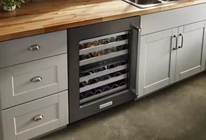 provides a built-in look within a standard 24" base cabinet, so your style stands out, not the appliance. Hidden hinges allow the wine cellar door to sit flush with surrounding cabinet fronts when closed yet easily swing open a full 115 degrees.