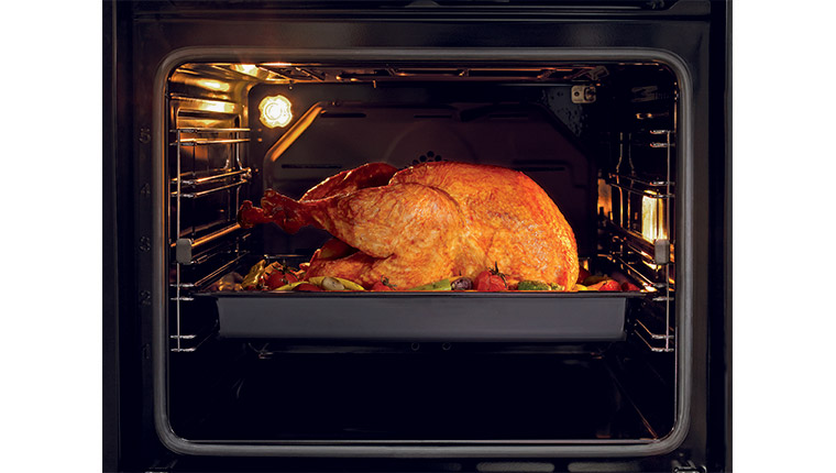 For full visibility while baking, braising, and roasting, Blomberg ovens feature bright interior lighting, including cylindrical lamps placed on the rear wall, and a non-reflective enamel surface that reduces glare on the glass oven door.