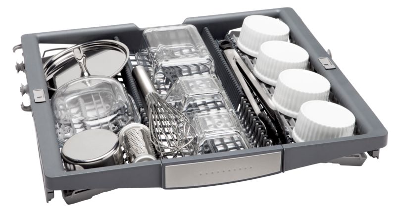 Our Flexible 3rd Rack features expandable wings that easily lower to accommodate more of your deeper items while adjustable tines let you customize the racks loading space to fit awkward bulky items.