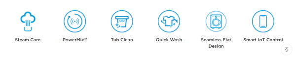 Pre Wash, Extra Rinse, Steam, Temp, Spin, Delay, Soil Level, Child Lock, My Cycle, Memory Function, Remaining Time Display, Running Progress Indicator, Reload