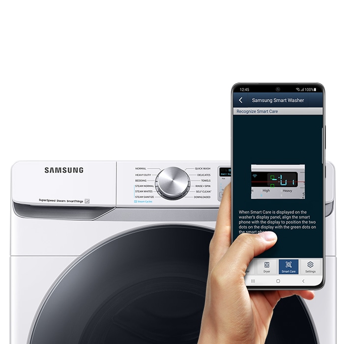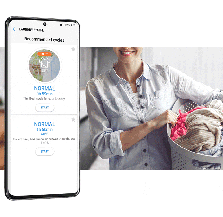 Use your washer more easily and effectively with the SmartThings App*. The Laundry Recipe recommends the best wash cycle***. The Laundry Planner optimizes your daily schedule****. A HomeCare Wizard enables troubleshooting. And Auto Cycle Link***** selects an optimal drying course after a wash.