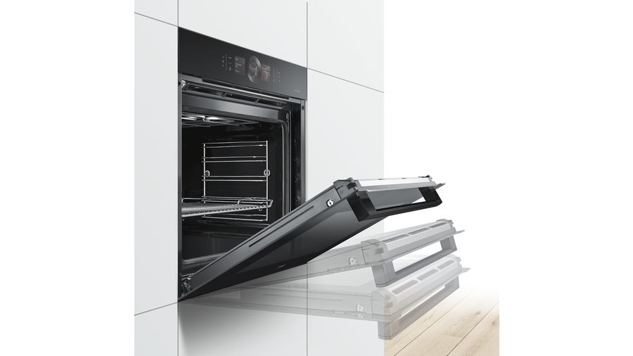Oven doors are now more convenient than ever: A special damping mechanism prevents oven doors from slamming shut. As you gently push the door shut, it stops just before closing and then shuts itself gently and quietly, thus guaranteeing a long life for both your oven and the oven door.