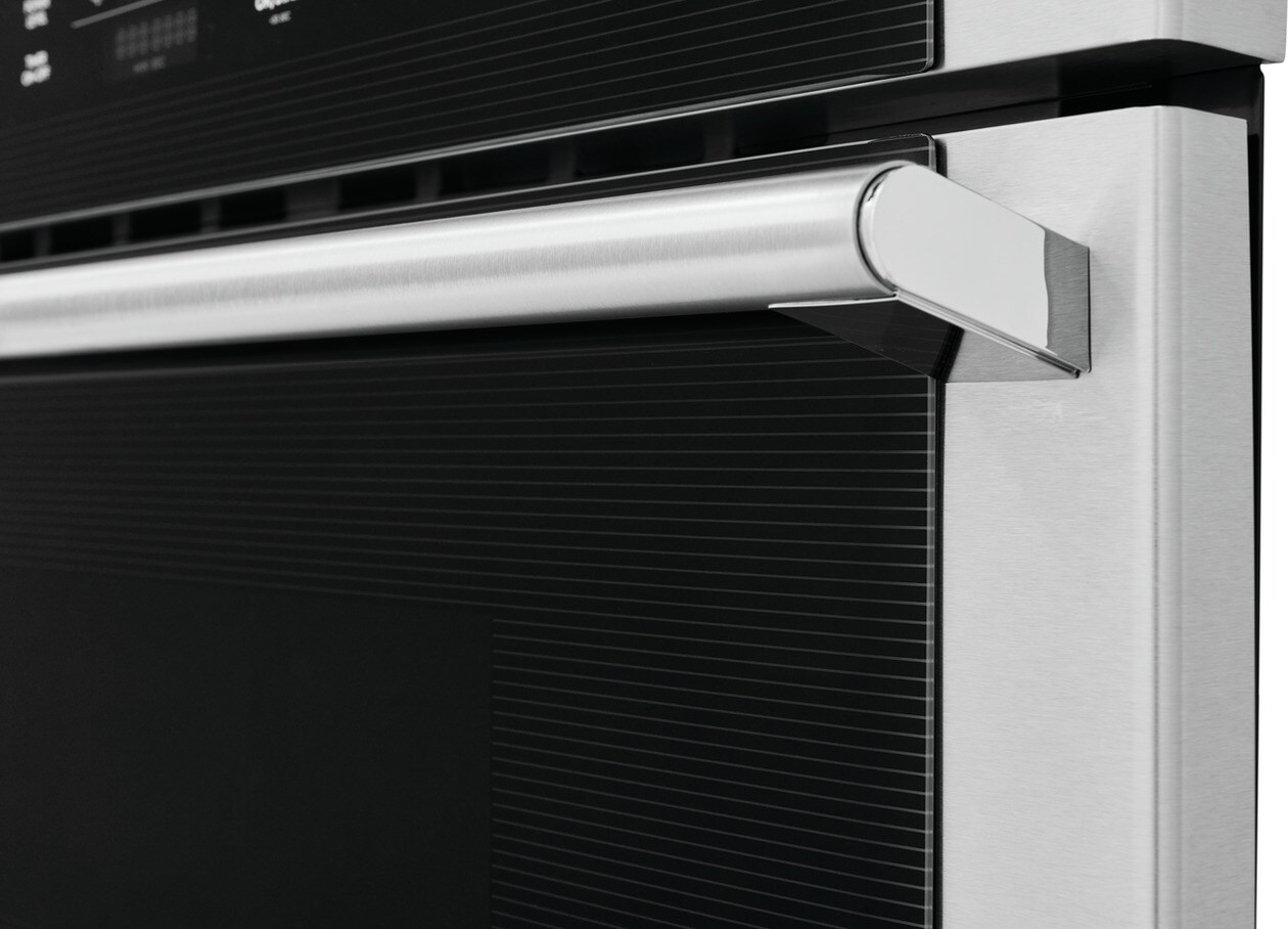The sleek design of this microwave with glass touch controls, stainless steel handle with gunmetal chrome standoffs and Electrolux signature pinstripe design looks beautiful in any kitchen