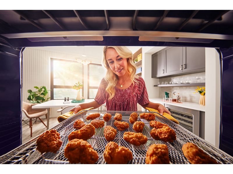 Get the crisp you crave, right from your oven. This 30" Double Wall Oven with Air Fry Mode circulates hot air around the included basket to cook with less oil.* An integrated thermometer takes the guesswork out of roasting meat just the way you like.*When compared to deep frying.
