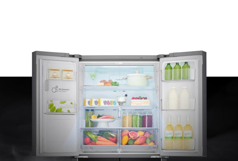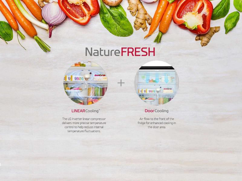 The combination of LG Inverter Linear Compressor and air flow design from the back and front vents helps to keep food fresher for longer and enhance cooling for stored items.