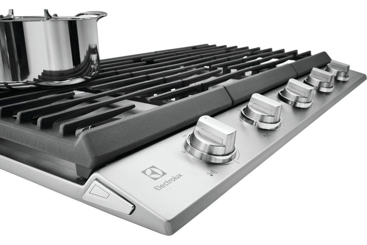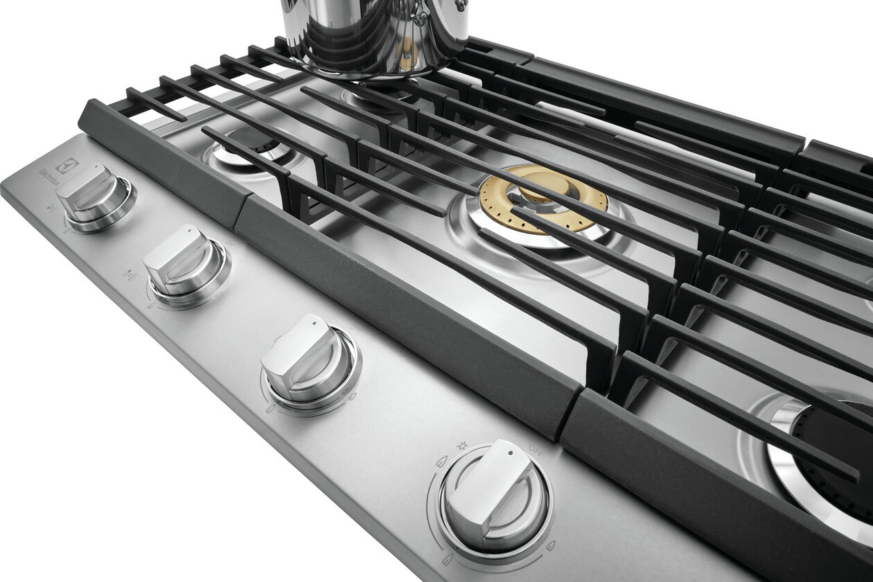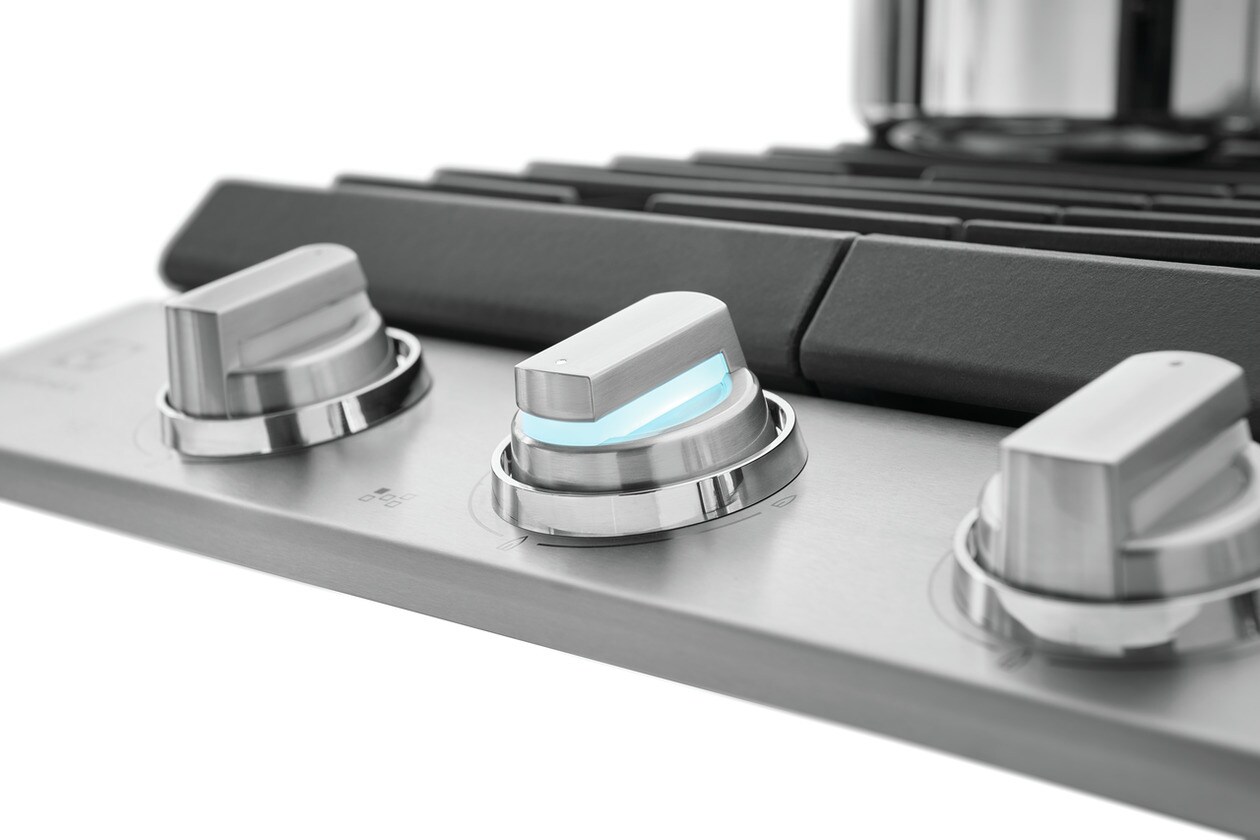 Full-framed linear grates, edge-to-edge front controls with sturdy LED backlit knobs and a premium brass burner accent lend to the sleek design that make this cooktop a focal point of your kitchen