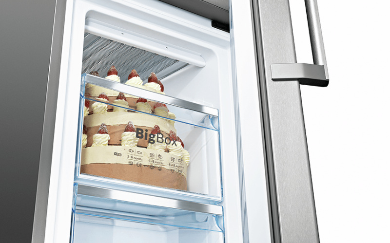 The Big Box is a frozen food drawer designed for practical stacking of frozen foods containers or larger items such as gateaux or pizzas. With its extra-high size, it provides enough space for storing large frozen goods, making it ideal for catering events like a child's birthday or freezing a wedding cake.