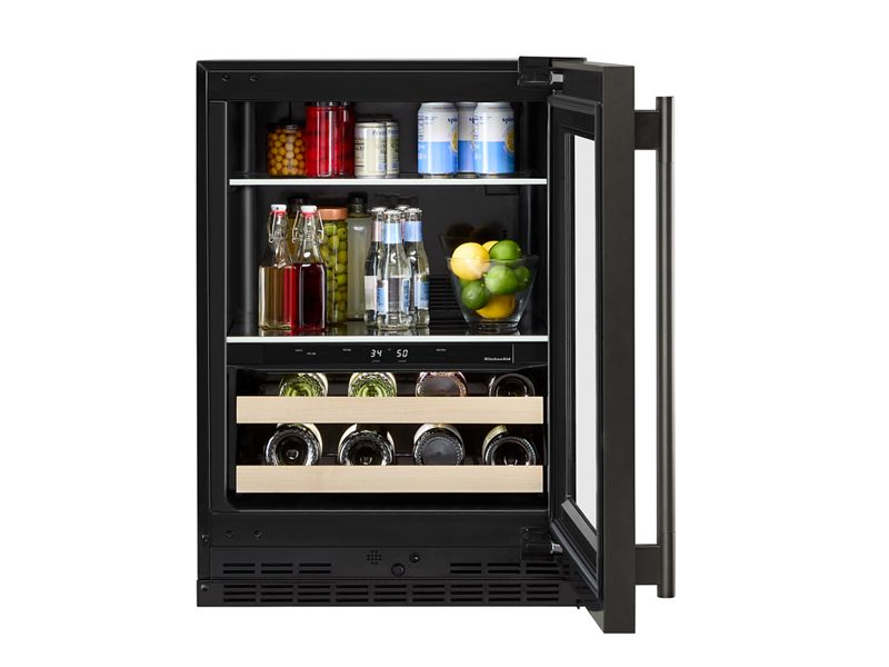 This 24" Undercounter Beverage Center with Full-Extension Wood-Front Racks stores 14 wine bottles below with room for drinks and food on the full-width shelves above. Two Temperature-Controlled Zones adjust for what you’re storing\, and a Temperature Monitoring System with sensor alert adds peace of mind. Fully Flush Installation with Hidden Hinges provides a built-in look within cabinetry.