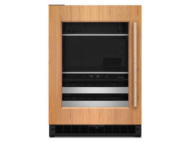 This 24" Undercounter Beverage Center with Full-Extension Metal-Front Racks stores 14 wine bottles below with room for drinks and food on the full-width shelves above. Two Temperature-Controlled Zones adjust for what you’re storing, and a Temperature Monitoring System with sensor alert adds peace of mind. This Panel-Ready appliance will seamlessly fit into your cabinetry, creating a cohesive look.