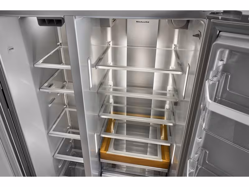 Make room for every grocery run and farmers market haul with this large capacity counter-depth side-by-side refrigerator from KitchenAid brand. Counter-depth design fits with surrounding cabinetry to create a built-in appearance. Panoramic LED Lighting illuminates every angle to keep ingredients in sight and easy to find. And an Exterior Ice and Water Dispenser with Measured Fill allows you to select and dispense the exact amount you need in ounces, cups or liters.
