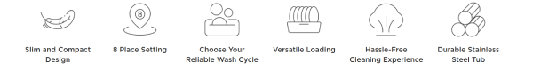 With room for up to 8 place settings, this dishwasher makes loading and unloading quick and easy, perfect for smaller households or entertaining.