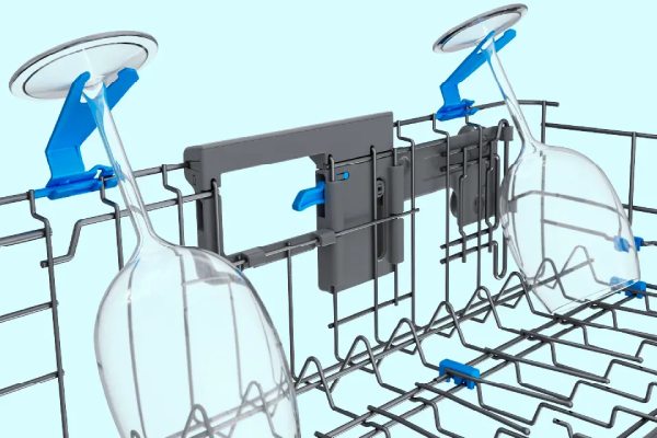 Specially shaped clips hold delicate stemware securely in place, preventing movement and tipping during the wash cycle.