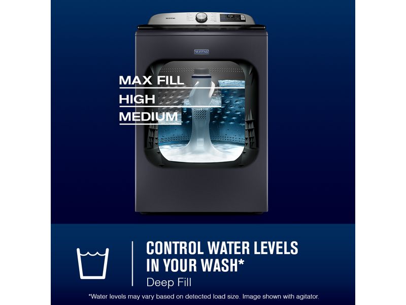 With every laundry cycle, Maytag brand delivers powerful cleaning with the Power™ agitator to break apart stains on your dirty clothes. Use Extra Power for boosted stain fighting on any wash cycle, while the Deep Fill option delivers more water when you want it with your choice of deeper water levels.* Plus, smart features help you stay in control and efficiently manage laundry from anywhere.** Use the Maytag™ app to remotely start or stop your appliance and get end of cycle notifications.*Bulky Items cycle only available with deepest water level.**WiFi & App Required. Features subject to change. Details & privacy info at maytag.ca/connect. Appliance must be set to remote enable.