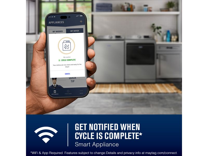 Get the MAYTAG™ App to stay in control and efficiently manage laundry from anywhere.*Stay on top of laundry with end of cycle notifications on your smart device to ensure finished loads aren’t left behind. Get step-by-step pretreating instructions in the Stain Guide to take on everyday tough stains and maximize the power of your Maytag® appliances.*Appliance must be set to remote enable. WiFi & App Required. Features subject to change. Details and privacy info at maytag.ca/connect.