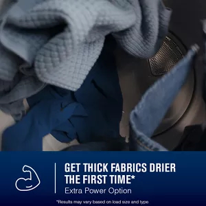 Extra Power option boosts drying power to get thick fabrics drier the first time.**Results may vary based on load size and type.