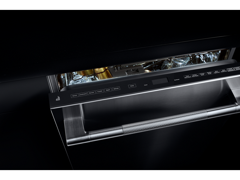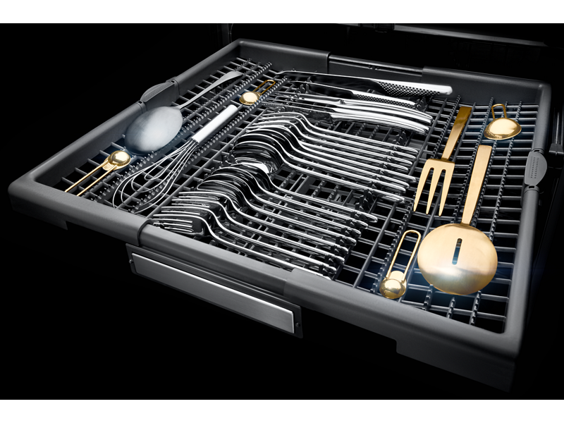 A JennAir® signature, these dramatic black racks are inspired by the beauty of volcanic glass—showcasing clean dishes in striking contrast.