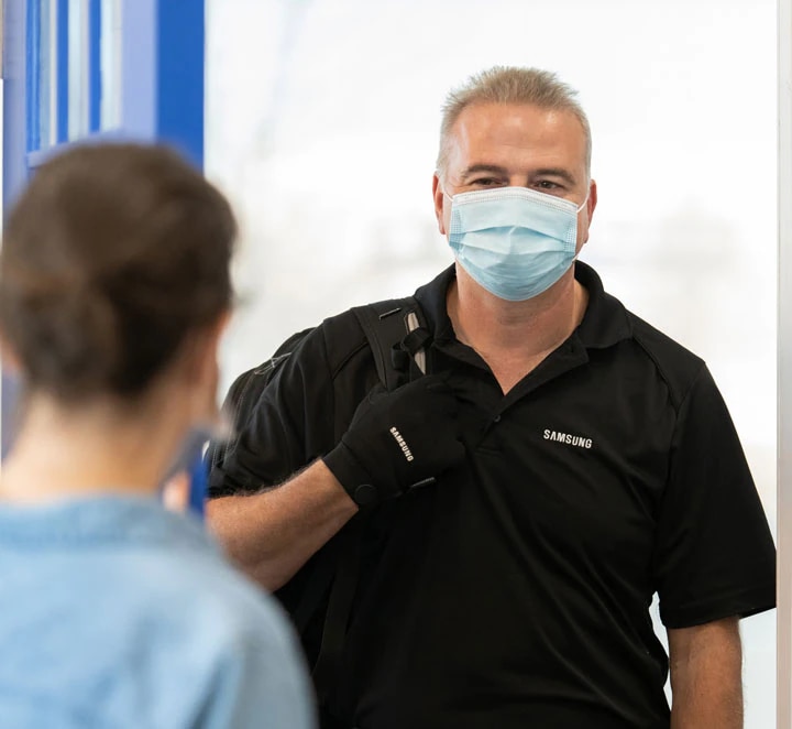 Samsung Certified Technicians will set up a service time around your available schedule. Our skilled, experienced, and trained technicians will examine and repair your appliance in the comfort and safety of your home. Samsung’s Branded Technicians will arrive at your home with the appropriate PPE equipment, respectfully disinfecting your appliance before and after repairs and ultimately providing you with excellent customer service. Learn more To schedule a Branded In-home Repair, contact us via Chat, text WECARE (932 273), or call 1-800-SAMSUNG, to schedule an appointment.3