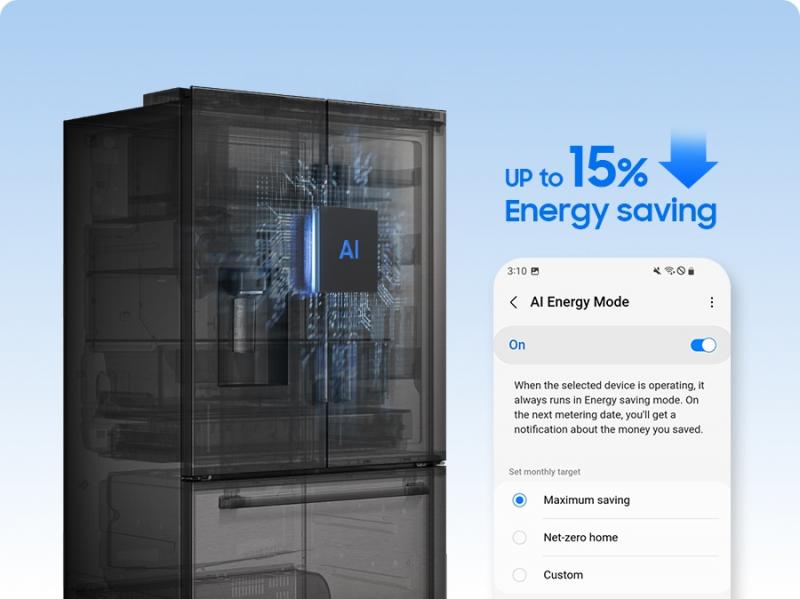 SmartThings Energy lets you monitor and manage your refrigerator's power usage. Reduce your energy use by up to 15%³with AI Energy mode, all from your phone.⁴