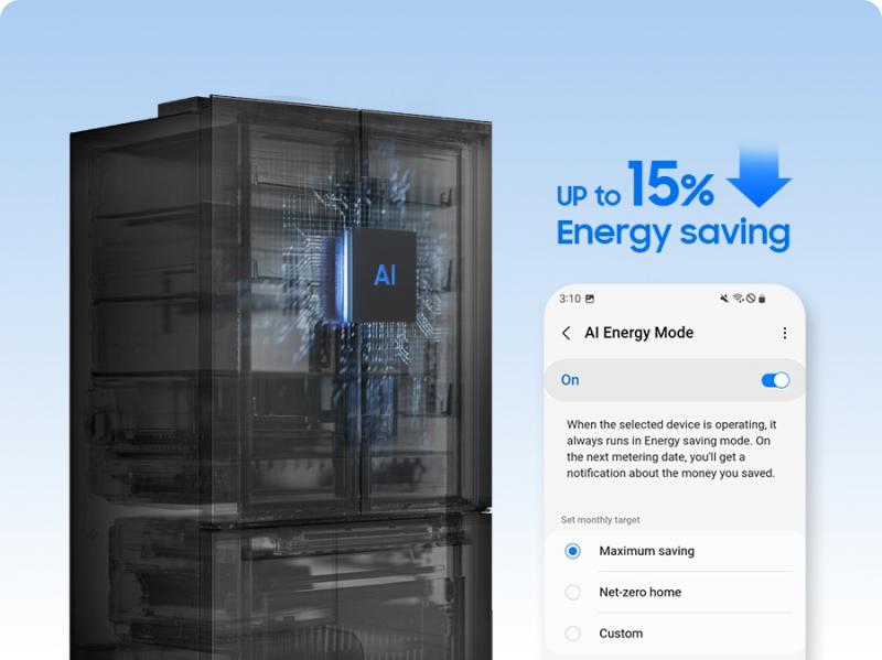³Comparing factory setting temperature without AI Energy mode and with AI Energy, which optimizes the compressor speed and defrost cycle based on usage pattern and conditions. Results may vary depending on the usage pattern and conditions. ⁴AI Energy Mode must be turned on in the SmartThings App available on Android and iOS devices. A Wi-Fi connection and a Samsung account are required.