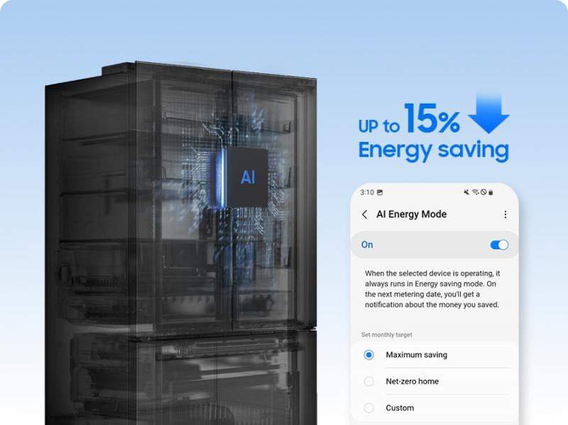 SmartThings Energy lets you monitor and manage your refrigerator's power usage. Reduce your energy use by up to 15%³ with AI Energy mode, all from your phone.⁴