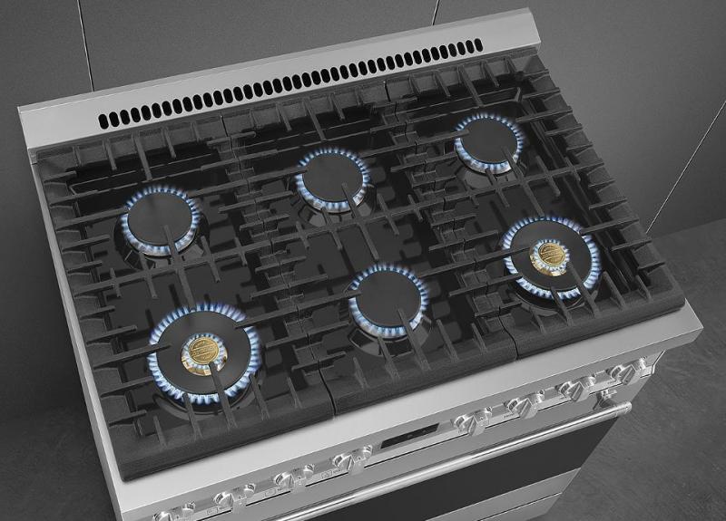The cooktop has a renewed look thanks to a black, enameled surface equipped with four standard burners and two additional powerful brass burners with an engraved SMEG logo.
