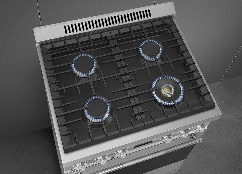 The cooktop has a renewed look thanks to a black, enameled surface equipped with three standard burners and an additional powerful brass burner with an engraved SMEG logo.