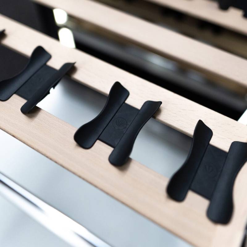 Easily arrange your wine collection on our patent pending bottle rests which adjusts for different bottle sizes.