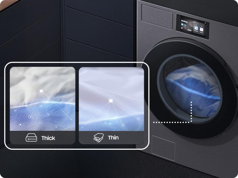 Wash your blankets intuitively, while saving time and water. The Bedding cycle senses the thickness of blankets (thin/thick*) and then adjusts the cycle time and water usage accordingly. So when a thin small blanket is detected, it reduces the washing time and the amount of water**.6