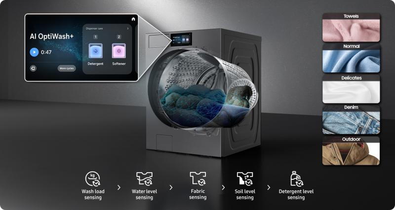 Clean clothes effortlessly, gently and efficiently*. AI OptiWash+ senses the laundry’s weight and uses the appropriate amount of water and detergent. It also detects the fabric**, now including Outdoor and Denim fabrics, and monitors the soiling level, adding detergent or rinsing time if needed.