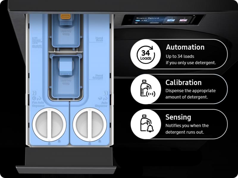 Get great washing results with less effort*. A Flex Auto Dispense System dispenses the right amount of detergent and softener for each load. It gives you the flexibility to use various detergents and softeners and holds enough for up to 20 loads, or up to 34 loads if you only use detergent**.1