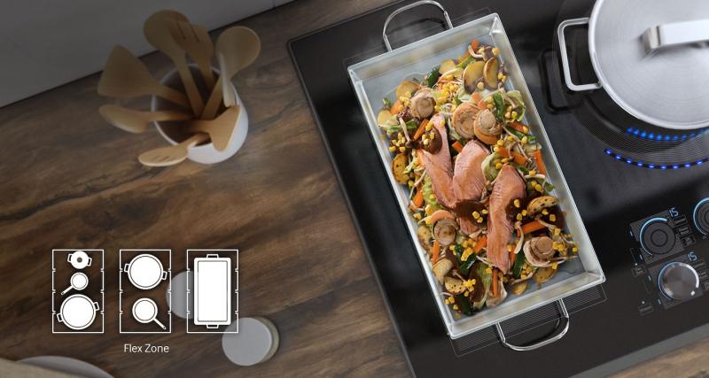 Use your oversized pots and pans to cook without worrying about evenly distributed heat.The FlexCook Zone is a large, open area that offers greater flexibility for cooking multiple dishes, by bridging two left elements to create one large element. It can accommodate different sizes of cookware to cook everything evenly and efficiently without “dead zones”.