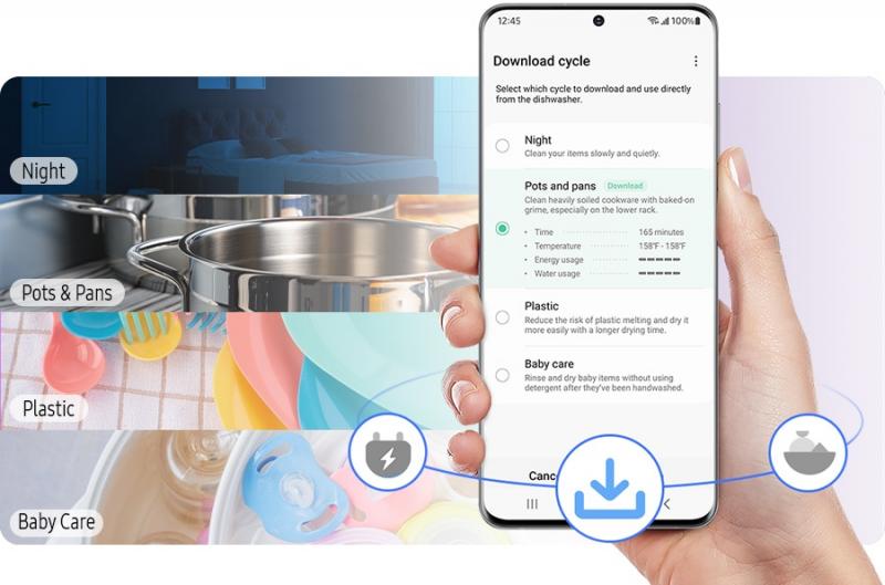 Download 4 additional cycles with your smartphone on the SmartThings App*: 'Plastic' to minimize warping, 'Pots & Pans' when cleaning items that are more soiled, 'Baby Care' to clean your baby's bottles and 'Night' cycle for even quieter washing.