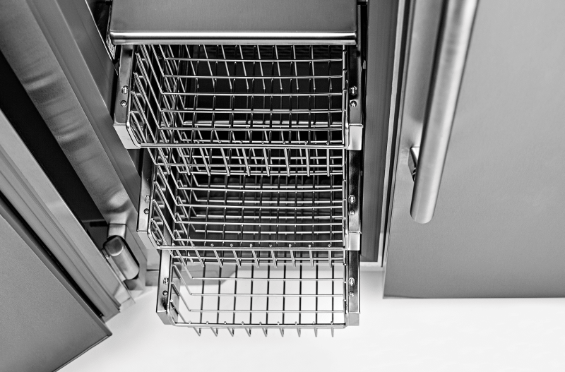 Our polished stainless steel wire baskets are classic in design and keep freezer space visually clean. Beyond their aesthetic appeal, the wire baskets whisper on soft-close slides for easy, quiet storage.