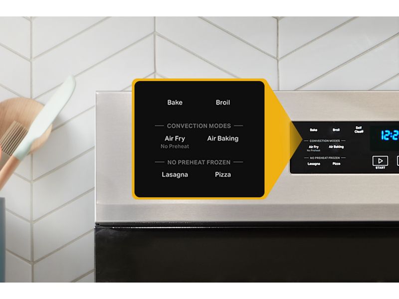 Auto On, Bake, Broil, Cancel/Off, Clock, Control Lock, Convect Modes, Cook Time Indicator, Delay Start, Frozen Bake, Keep Warm/Warm Hold, No Preheat - Air Fry, Sabbath Mode, Start Time, Stop Time, Timer