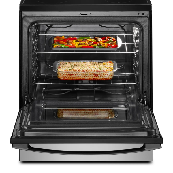 This 30-inch Amana® Electric Range comes with Bake Assist Temps to help you get dinner going. Simply choose a preset temperature setting to get started. Or set your bake or broil temperatures with Easy Touch Electronic Controls Plus, which are extra-large and easy-to-read. And when you need to know how your dinner is doing without opening the oven door, the Extra-Large Oven Window lets you see and savour.