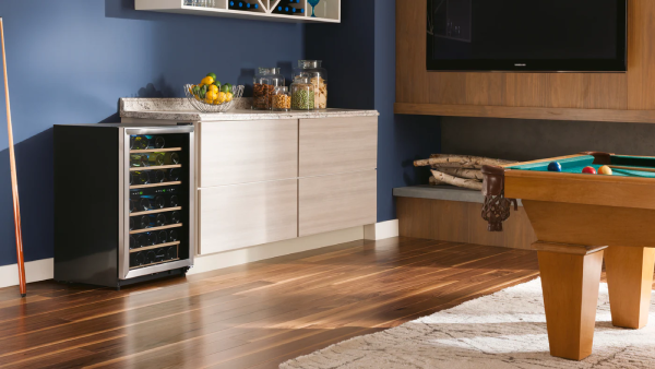 This Frigidaire wine cooler holds up to 45 bottles and offers two temperature zones to keep your favorites at the perfect temperature. The sleek design with the stainless-steel door, tinted window and natural wood shelving will complement your room and our reversible door gives you the flexibility to adapt and ensure it’s a perfect fit.