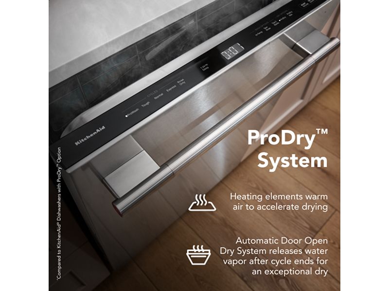 opens door 4" after the dry cycle ends to release water vapor and provide natural ventilation for an exceptional dry. Use the Automatic Door Open Dry System alone for our most energy efficient dry* or pair with ProDry™ option for improved drying performance.*Compared to KitchenAid® Dishwashers when using ProDry™ Option