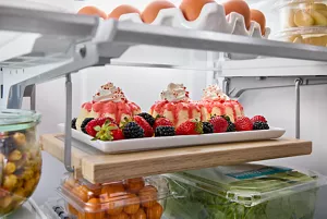 Adjusts to accommodate items of different heights. Lower the shelf to hold short items like a pint of berries, jam jars or yogurt cups. When not needed, it nests into the shelf above, making room for tall items like wine bottles and freshly squeezed juice.