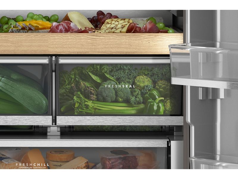 wows from the inside out with premium craftsmanship and design. Wood-look trim, metallic touchpoints, smoked crisper bins and ultra-bright LED lighting pop against the stunning silver-colored finish.