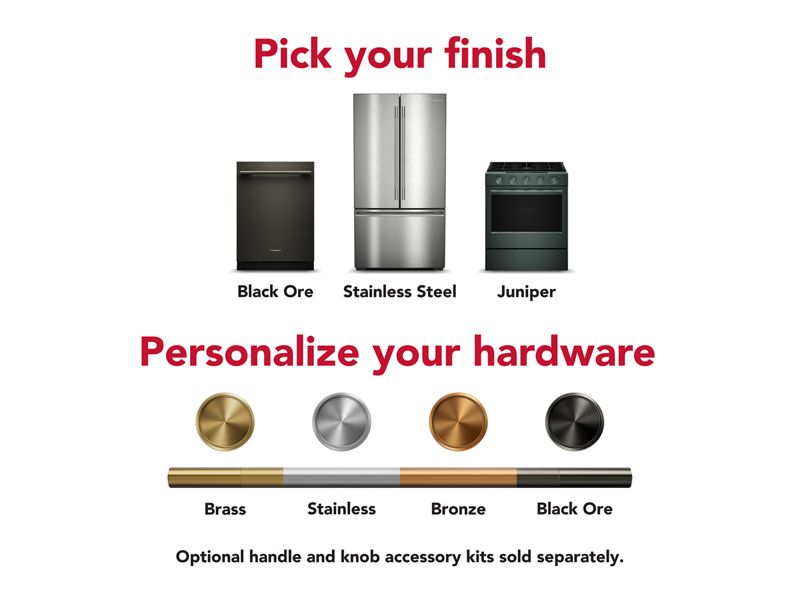 with a curated palette of exterior finishes and mixed metal hardware. Pick from lush Juniper, warm Black Ore and classic Stainless Steel finishes, all with matching handles. Personalize your hardware with optional handle kits in Brass, Bronze, Black Ore and Stainless Steel.