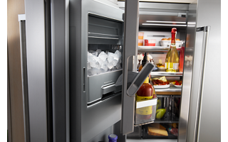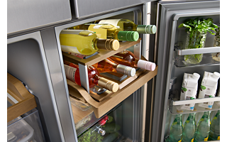 Designed with entertaining in mind, the KitchenAid® 4-Door Counter-Depth refrigerator with Exterior Ice and Water is the life of the party with its show-stopping interior, large capacity ice production, removable beverage caddy and more. Experience our most customizable multi-zone cooling system, including a Flexible Temperature Zone, that goes from refrigerator to freezer to wine cellar at the touch of a button —allowing you to adjust capacity as needed.