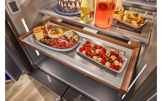 are a versatile area for storing platters, organizing ingredients and keeping items easily accessible. It comes in a wood-look finish and freezer compartment trays remove fully for easy cleaning.
