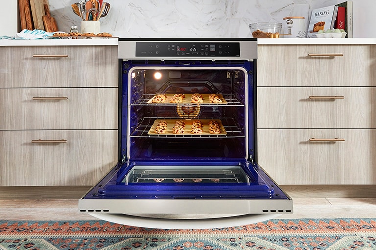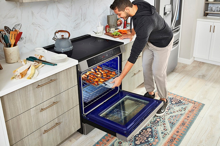 Using a third heating element attached to the fan, LG’s True Convection technology distributes precise heat and hot air circulation to ensure your food is cooked evenly on every rack. Enjoy deliciously browned and crispy meals, plus faster preheating and cook times.*