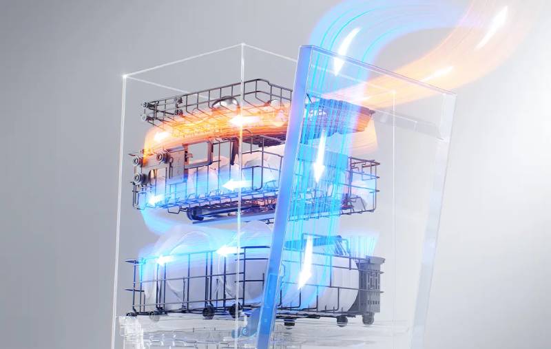 Achieve perfectly dry results in less time with Sensor TruDry™, an intelligent 3-stage drying system that monitors your load in real-time. Heated air dries every item while a smart sensor tracks temperature and humidity inside the tub. Once drying is nearly complete, the door automatically opens to release damp air and circulate fresh air in, as the convection system adjusts airflow, leaving your dishes dry, spot-free, and ready to put away faster.