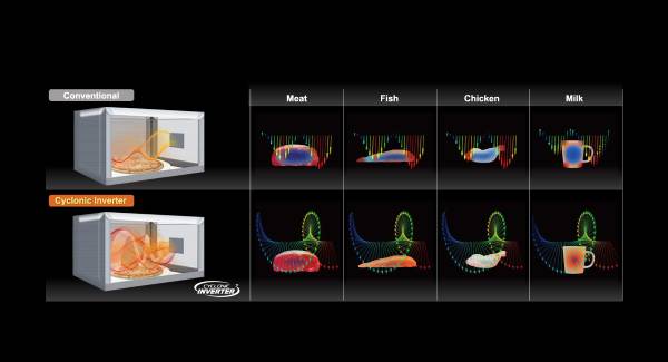 Microwaves in 3D Cyclonic Wave Technology evenly distributes energy throughout the entire cavity and heats any size or shape of food evenly.